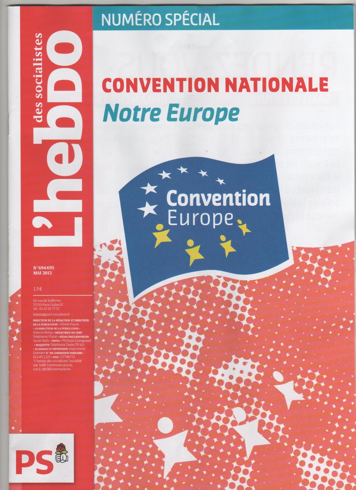 J'ai reçu, au courrier d'hier , le texte socialiste sur l'Europe (en vignette) qui a provoqué une polémique avec l'Allemagne, il y a quelques jours (avant modification). Il est désormais soumis au débat des adhérents et à leur vote, le 6 juin. La section d' Antibes organisera donc une réunion qui sera, à n'en pas douter, passionnante. Pourtant, ce sont plutôt les conventions (comme on les appelle) sur les questions intérieures, économiques et sociales, qui mobilisent les socialistes. Mais là, c'est différent.